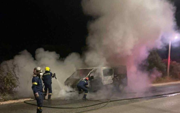 Τουριστικό βαν τυλίχθηκε στις φλόγες το βράδυ του Σαββάτου στη Λεωφόρο Σπάτων – Αρτέμιδος, κοντά στο αεροδρόμιο «Ελευθέριος Βενιζέλος».