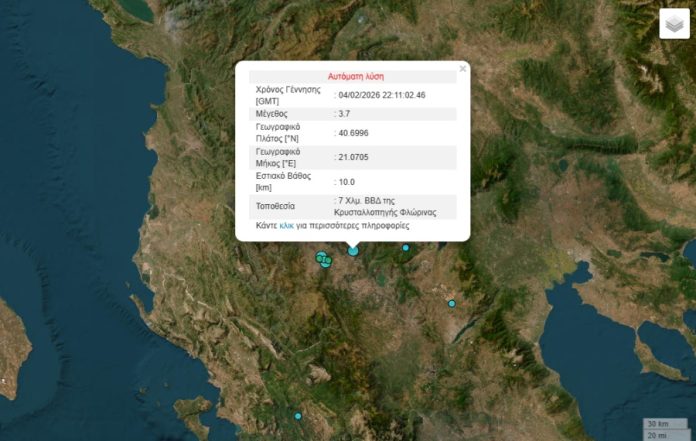 Σεισμός μεγέθους 3,7 ρίχτερ σημειώθηκε στη Φλώρινα και συγκεκριμένα 7χλμ ΒΒΔ της Κρυσταλλοπηγής.