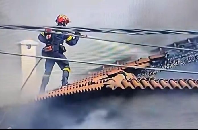 Βίντεο: Η στιγμή που πυροσβέστης ανεβαίνει στη σκεπή φλεγόμενου σπιτιού στην Παλαιά Φώκαια