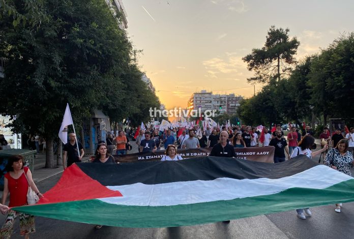 Πορεία αλληλεγγύης στον παλαιστινιακό λαό είναι σε εξέλιξη αυτή την ώρα στο κέντρο της Θεσσαλονίκης.