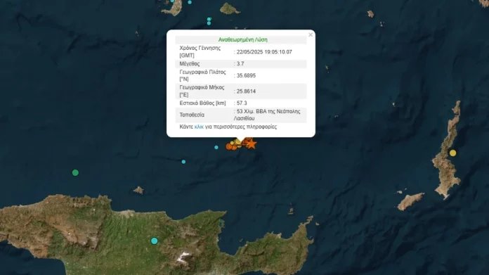 Σεισμός μεγέθους 3,7 βαθμών έγινε την Πέμπτη, στις 22:05, με επίκεντρο 53 χιλιόμετρα βόρεια-βορειοανατολικά...