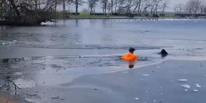Viral βίντεο: Η στιγμή που 31χρονος βουτά στα παγωμένα νερά μιας λίμνης για να σώσει έναν σκύλο