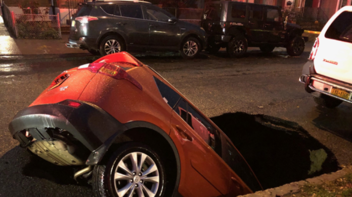 Νέα Υόρκη: Τεράστια τρύπα που άνοιξε ξαφνικά σε δρόμο στο Κουίνς «κατάπιε» αυτοκίνητο-(ΦΩΤΟ)
