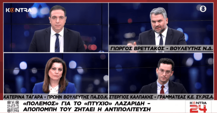Στο studio του Kontra Channel, με τον Κωνσταντίνο Μαραβελίδη, ο βουλευτής της Νέας Δημοκρατίας, Γιώργος Βρεττάκος, η πρώην βουλευτής του ΠΑΣΟΚ-ΚΙΝΑΛ, Κατερίνα Ταγαρά και ο γραμματέας της Κ.Ε του...