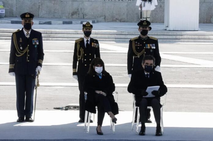 Η Πρόεδρος της Ελληνικής Δημοκρατίας, Κατερίνα Σακελλαροπούλου, εικονίζεται σταυροπόδι στην σημερινή παρέλαση και Εθνική μας επέτειο των 200 ετών από την απελευθέρωσή μας.
