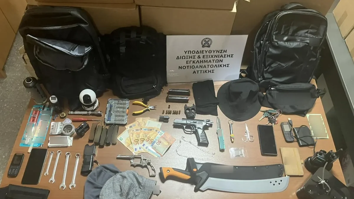 Σε έρευνες σε σπίτια στην Αττική και με τη συνδρομή αστυνομικών του Τμήματος Δίωξης και Εξιχνίασης Εγκλημάτων Σπάρτης σε δωμάτιο ξενοδοχείου στην Λακωνία όπου εντοπίστηκε και η 23χρονη, βρέθηκαν και κατασχέθηκαν: Πιστόλι, 2 γεμιστήρες, σκοπευτικό όπλου, 18 φυσίγγια, συσκευή ηλεκτρικής εκκένωσης (τέιζερ), σκελετός περιστρόφου, 5 κροτίδες, 2 ασύρματοι, σιδερογροθιά, σπαθί τύπου κατάνα, διαρρηκτικά εργαλεία, πλήθος κινητών τηλεφώνων και το χρηματικό ποσό των200 ευρώ.