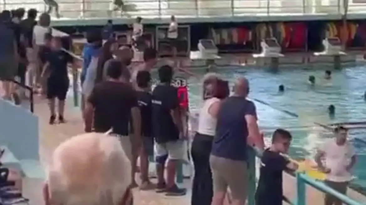 Σε βίντεο που κατέγραψαν αυτόπτες μάρτυρες φαίνονται ενήλικες να κρέμονται από τα κάγκελα του κολυμβητηρίου και να καταφέρονται κατά των ανήλικων παιδιών.