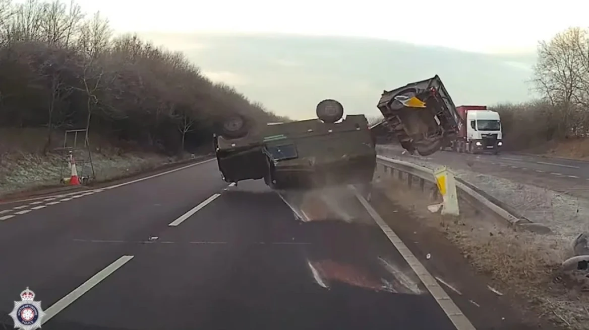 Συγκεκριμένα, στο βίντεο φαίνεται το στρατιωτικό όχημα, ένα τζιπ Land Rover Defender να κινείται στην αριστερή λωρίδα, έχοντας προσαρμοσμένο συνοδευτικό φορτίο.