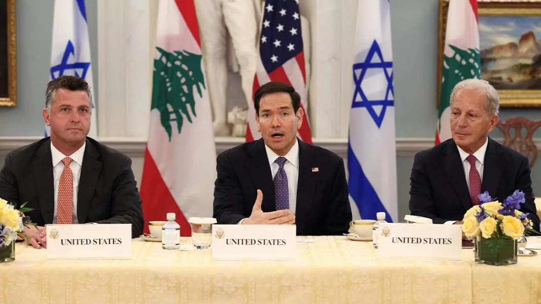Το Υπουργείο Εξωτερικών των ΗΠΑ συγκάλεσε τριμερή συνάντηση στις 14 Απριλίου 2026, με τη συμμετοχή του Υπουργού Εξωτερικών Μάρκο Ρούμπιο, του Συμβούλου Μάικλ Νίντχαμ, του Πρέσβη των Ηνωμένων Πολιτειών στον Λίβανο Ίσα, του Πρέσβη του Ισραήλ στις Ηνωμένες Πολιτείες Γεχίελ Λάιτερ και της Πρέσβη του Λιβάνου στις Ηνωμένες Πολιτείες Νάντα Χαμαντέχ Μοουάντ.