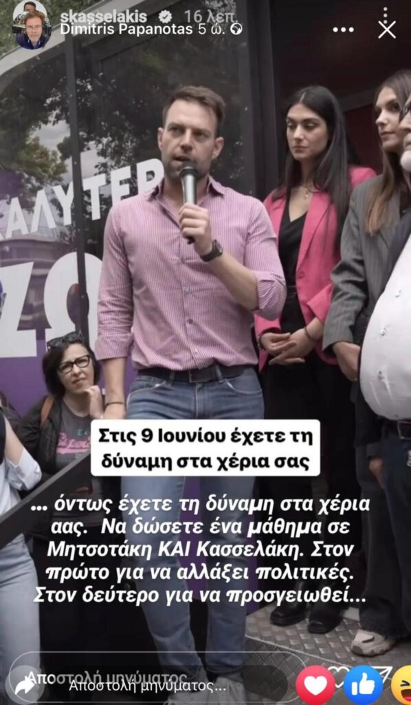 Ο δημοσιογράφος που τέθηκε εκτός ευρωψηφοδελτίου από τον Στέφανο Κασσελάκη μετά τον σάλο που ξέσπασε από παλαιότερες δηλώσεις του σχετικά με τις κακοποιημένες γυναίκες σχολίασε με ανάρτησή του στο facebook τη φράση του προέδρου του ΣΥΡΙΖΑ ότι «στις 9 Ιουνίου έχετε τη δύναμη στα χέρια σας» γράφοντας τα εξής: «όντως έχετε τη δύναμη στα χέρια σας. Να δώσετε ένα μάθημα σε Μητσοτάκη και Κασσελάκη. Στον πρώτο για να αλλάξει πολιτικές και στον δεύτερο για να προσγειωθεί».