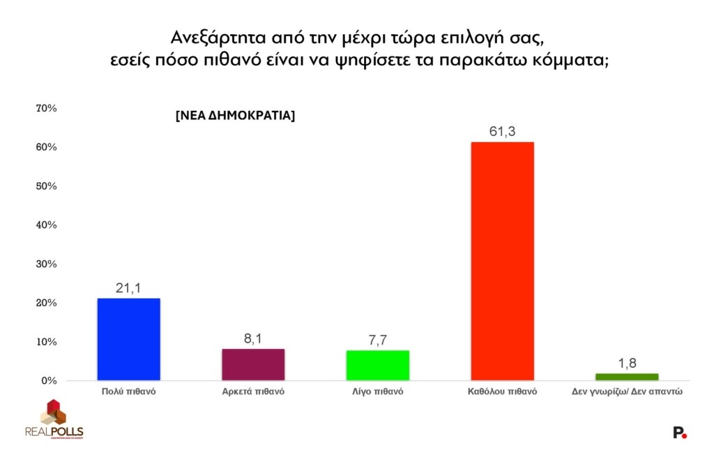 Ως προς το «κόμμα Σαμαρά» τα ποσοστά είναι πολύ πιο χαμηλά: μόλις το 2,2% απαντά ότι είναι «πολύ πιθανό» να το ψηφίσει και ένα 5,9% ότι είναι «αρκετά πιθανό», σύνολο 8,1%, περισσότερες από δύο μονάδες κάτω από το 10,4% (3,8% και 6,6%) της μέτρησης του Νοεμβρίου.