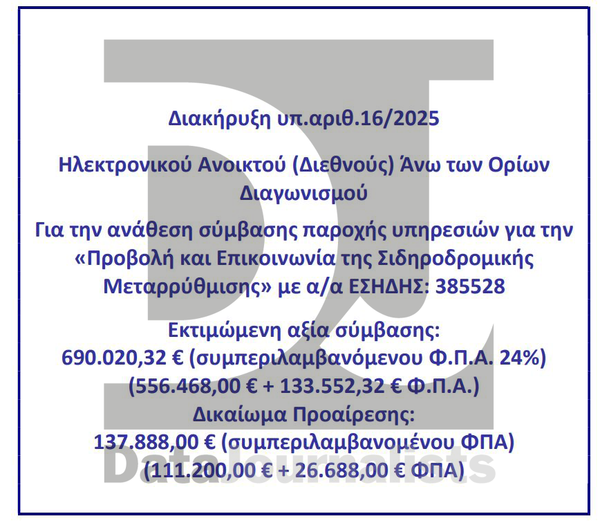 Παρά ταύτα, το υπουργείο Υποδομών και Μεταφορών έχει στον αέρα την διακήρυξη με αριθμό 16/2025, ηλεκτρονικού ανοικτού διεθνούς άνω των ορίων διαγωνισμού για την ανάθεση σύμβασης παροχής υπηρεσιών για την «Προβολή και Επικοινωνία της Σιδηροδρομικής Μεταρρύθμισης». Η εκτιμώμενη αξία της σύμβασης είναι 690.020,32 ευρώ μαζί με τον ΦΠΑ (556.468,00 € + 133.552,32 € Φ.Π.Α.), ενώ υπάρχει δικαίωμα προαίρεσης για την επέκτασή της κατά 137.888,00 ευρώ (111.200,00 € + 26.688,00 € ΦΠΑ). Δηλαδή συνολικά 827.908,32 ευρώ, εκ των οποίων τα 160.240,32 για τον ΦΠΑ.