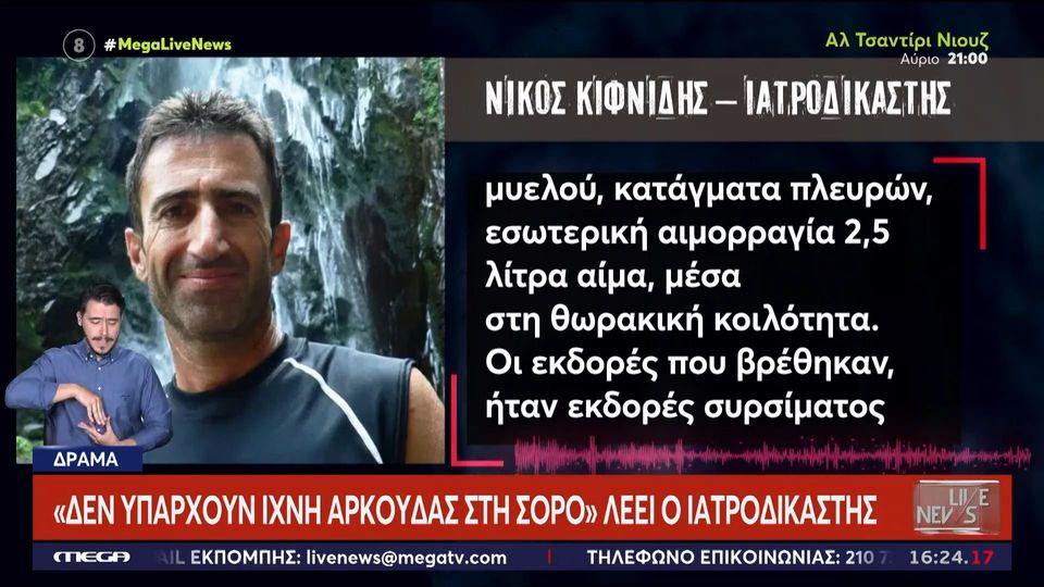 Συγκεκριμένα, τα ευρήματα στο πόρισμα του ιατροδικαστή που τέλεσε την εξέταση αναγράφουν: Κάταγμα σπονδυλικής στήλης και θωρακικής και αυχενικής μοίρας, ρήξη νωτιαίου μυελού, κατάγματα πλευρών, εσωτερική αιμορραγία.
