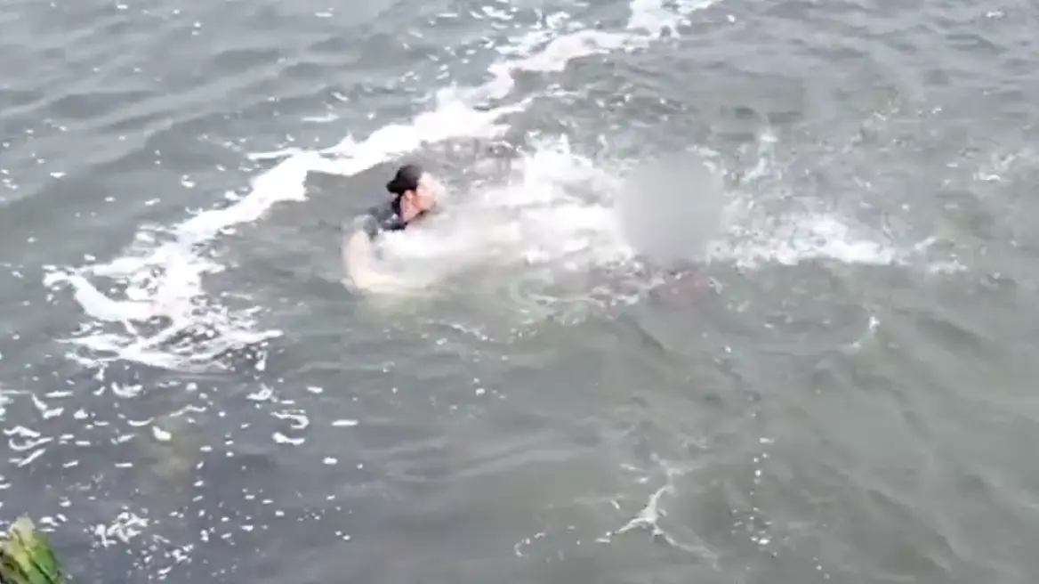 Ο 24χρονος, όμως, όχι μόνο δεν σταμάτησε αλλά έπεσε στο νερό με την αστυνομικό να βγάζει τον εξοπλισμό της και να πέφτει επίσης στο νερό ενώ ο συνάδελφός της καλεί σε βοήθεια μέσω ασυρμάτου.