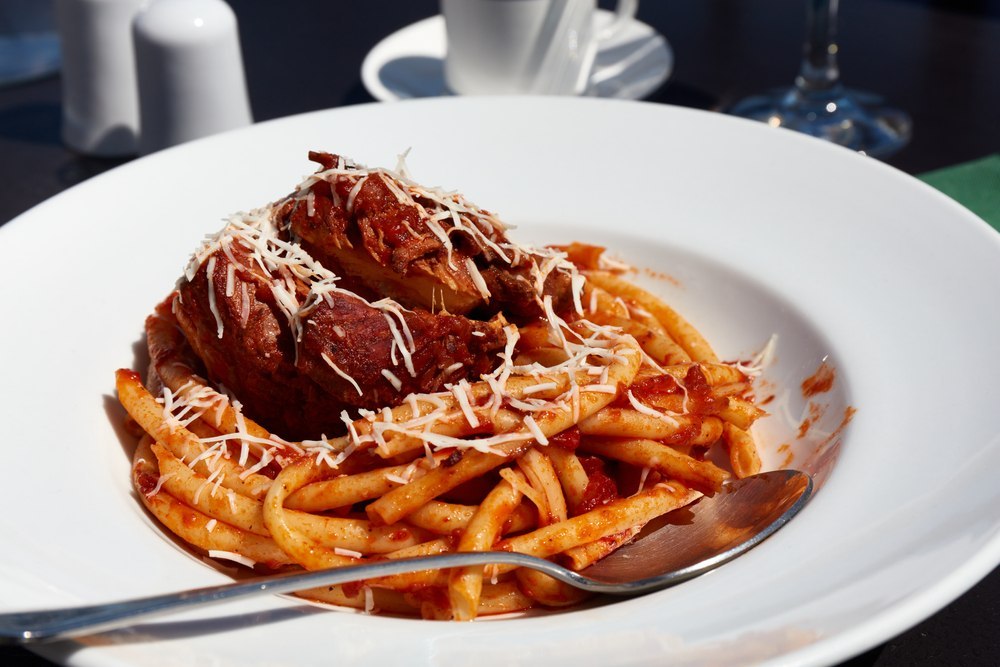 Σερβίρουμε με χοντρά μακαρόνια για παστίτσιο ή με ριγκατόνι και τριμμένο τυρί.
