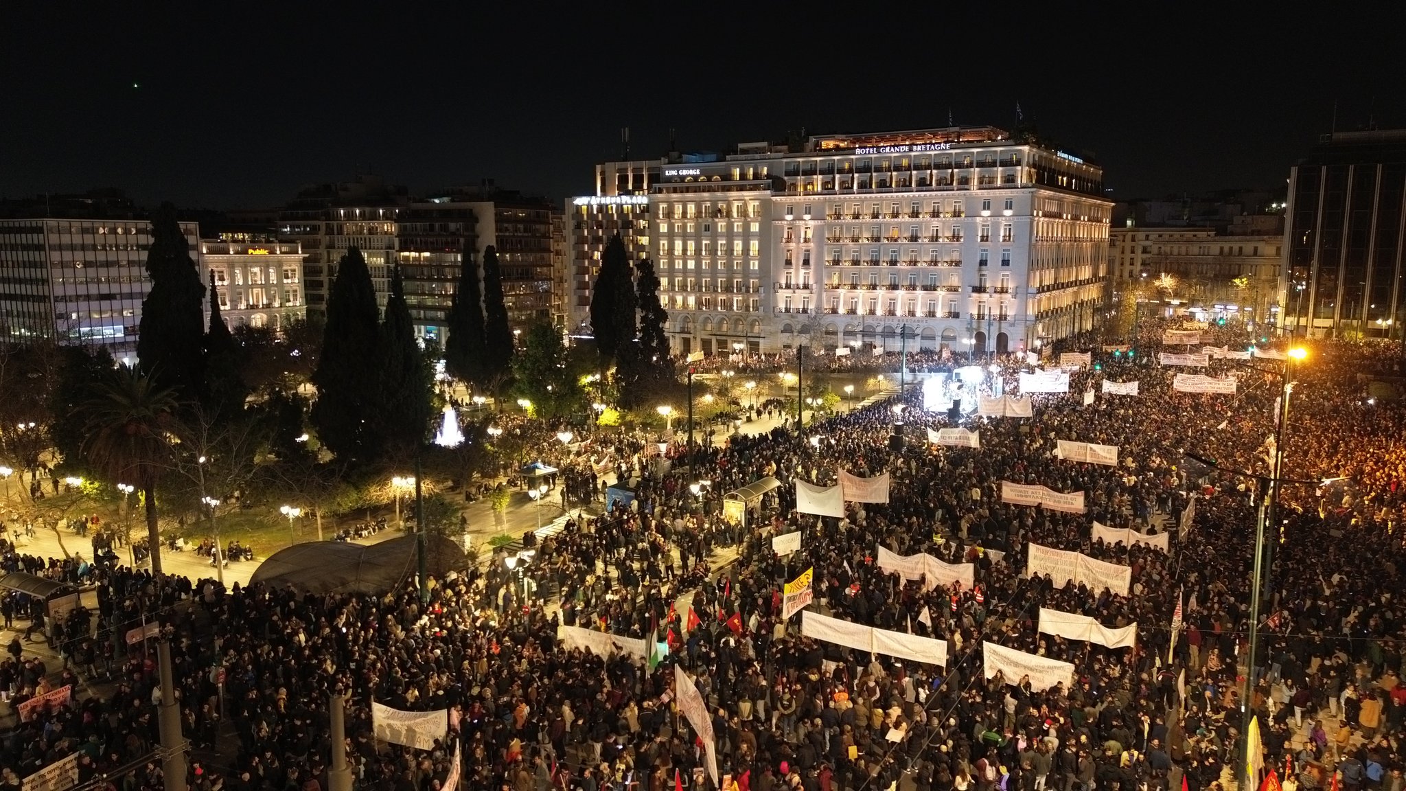 Με υπόκρουση τραγούδια γραμμένα για την τραγωδία στα Τέμπη και συνθήματα συμπαράστασης στους συγγενείς τους και στον αγώνα τους να αποδοθεί δικαιοσύνη, πολλές χιλιάδες κόσμου διαδηλώνει στην πλατεία Συντάγματος.