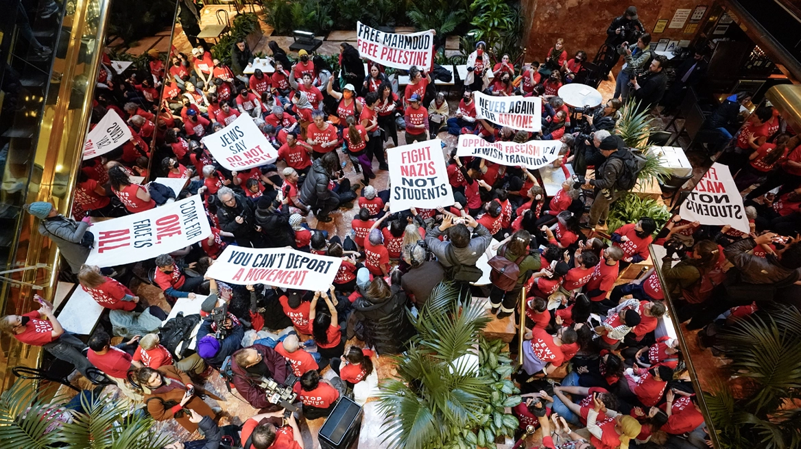 Εκατοντάδες διαδηλωτές συγκεντρώθηκαν στο λόμπι του Trump Tower στη Νέα Υόρκη, διαμαρτυρόμενοι για τη σύλληψη του φοιτητή Μαχμούντ Χαλίλ.