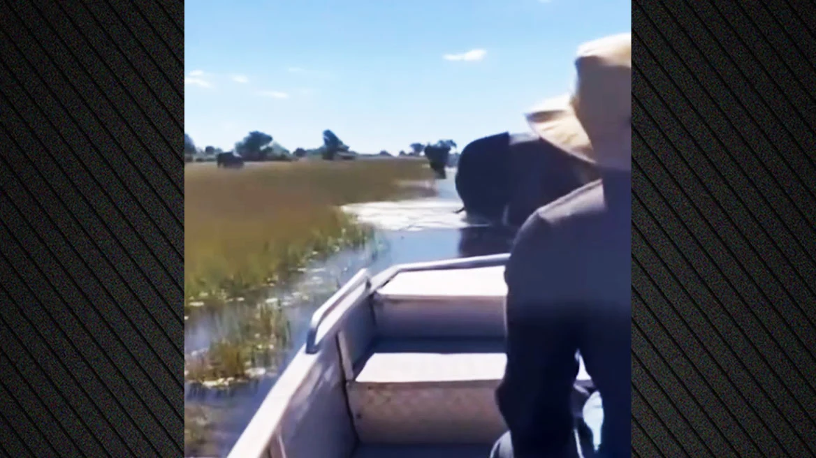 Για καλή τους τύχη οι χαυλιόδοντες γλιστρούν και το σκάφος πέφτει με δύναμη στο ποτάμι, που είναι γεμάτο κροκόδειλους και ιπποπόταμους.