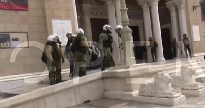 Σε εικόνες που μετέδωσε το Open, κουκουλοφόροι προβοκάτορες μπήκαν και μέσα στην Μητρόπολη, με τους αστυνομικούς να τους κυνηγούν, την ώρα που διαδηλωτές ζητούσαν να σταματήσει η ένταση.