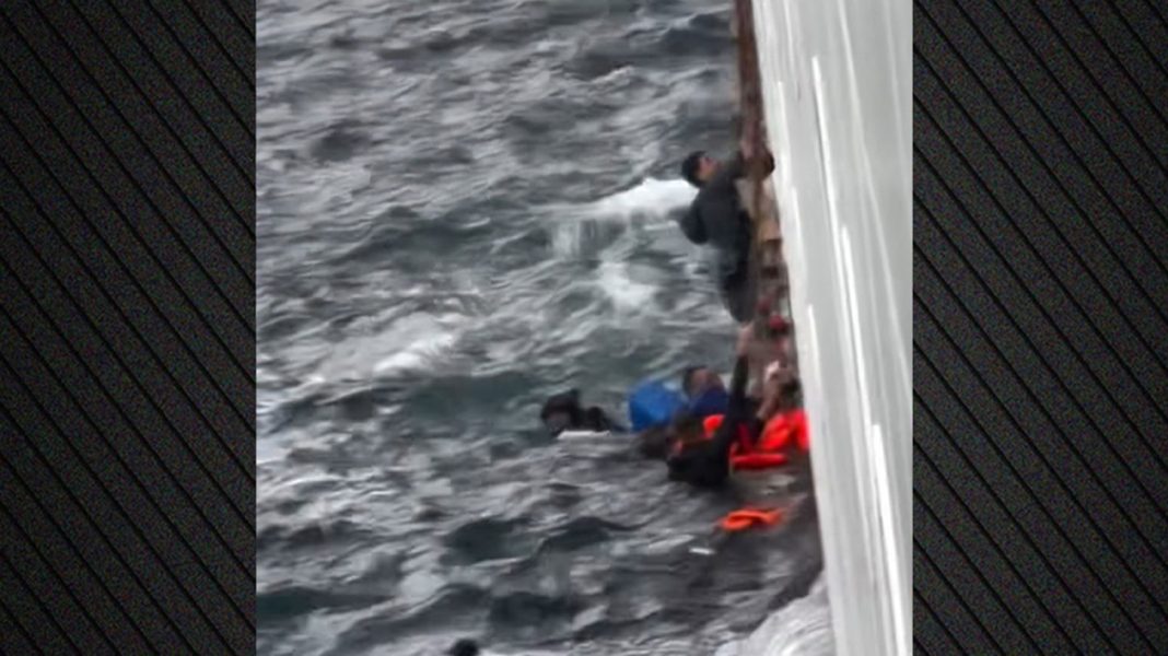 Το δραματικό βίντεο δείχνει τους μετανάστες να παλεύουν με τα κύματα καθώς προσπαθούν επανειλημμένα να ανέβουν τη σκάλα του πλοίου, πέφτοντας ξανά και ξανά στη θάλασσα.