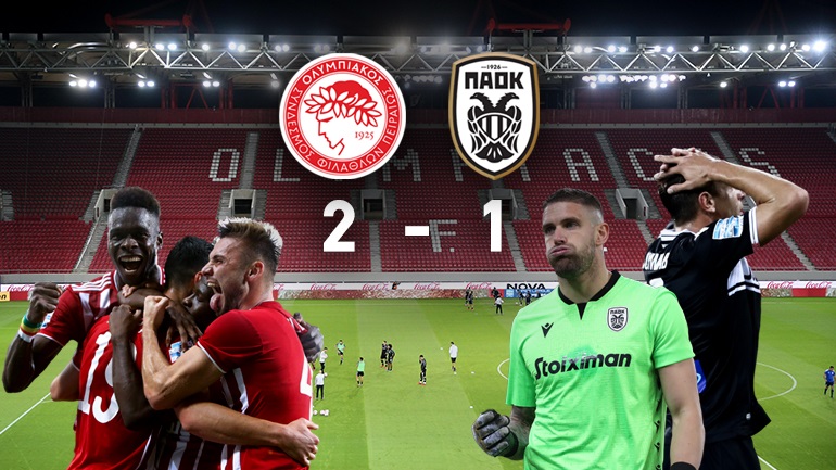 Ο Ολυμπιακός, έστω κι αν αγχώθηκε στο τέλος, επιβλήθηκε με 2-1 σκορ του ΠΑΟΚ, στο μεταξύ τους ντέρμπι για την 7η αγωνιστική της Super League, που διεξήχθη την Κυριακή στο -κεκλεισμένων των θυρών, λόγω τιμωρίας- «Γ. Καραϊσκάκης», επιστρέφοντας έτσι στην κορυφή της βαθμολογίας (σ.σ.: σε αυτήν είχε περάσει προσωρινά η ΑΕΚ μετά τη νίκη της με 3-1 επί του Βόλου).
