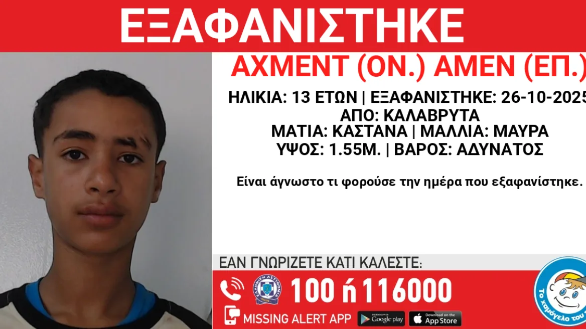 Εξαφανίστηκε το απόγευμα της Κυριακής 26 Οκτωβρίου από χώρο φιλοξενίας ασυνόδευτων ανηλίκων στην περιοχή των Καλαβρύτων, ο Αχμέντ Αμέν, 13 ετών, αιγυπτιακής καταγωγής.