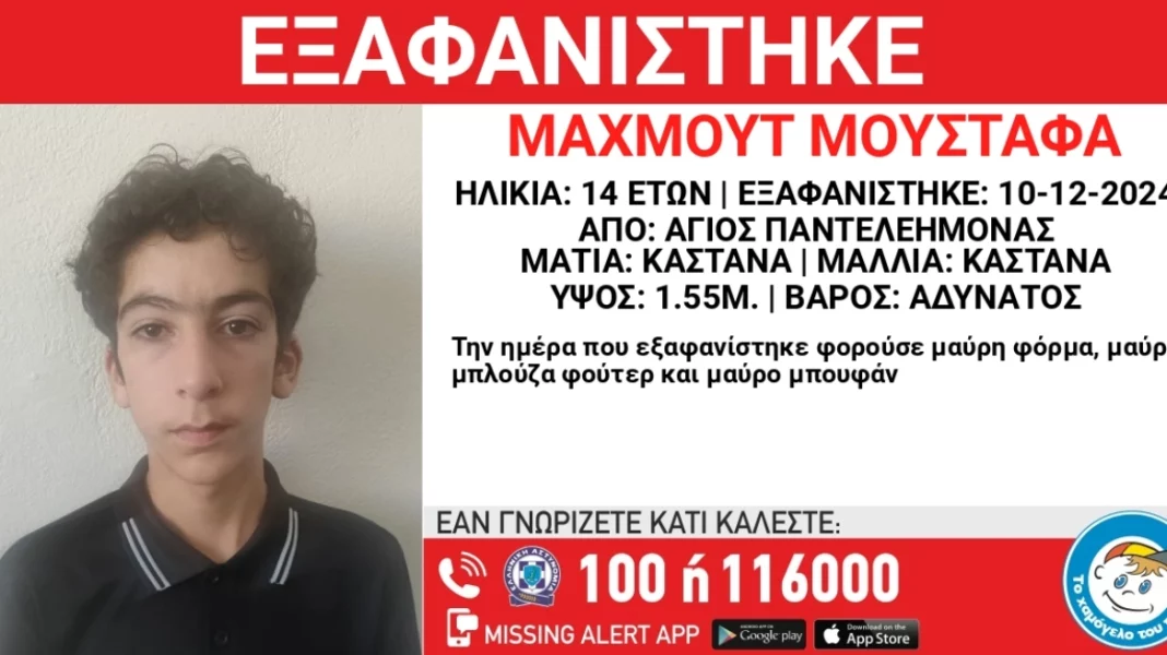 Ο 14χρονος Μαχμούτ Μουσταφά έχει ύψος 1.55 μ., είναι αδύνατος, έχει καστανά μαλλιά και καστανά μάτια – Την ημέρα που εξαφανίστηκε φορούσε μαύρη φόρμα, μαύρη μπλούζα φούτερ και μαύρο μπουφάν