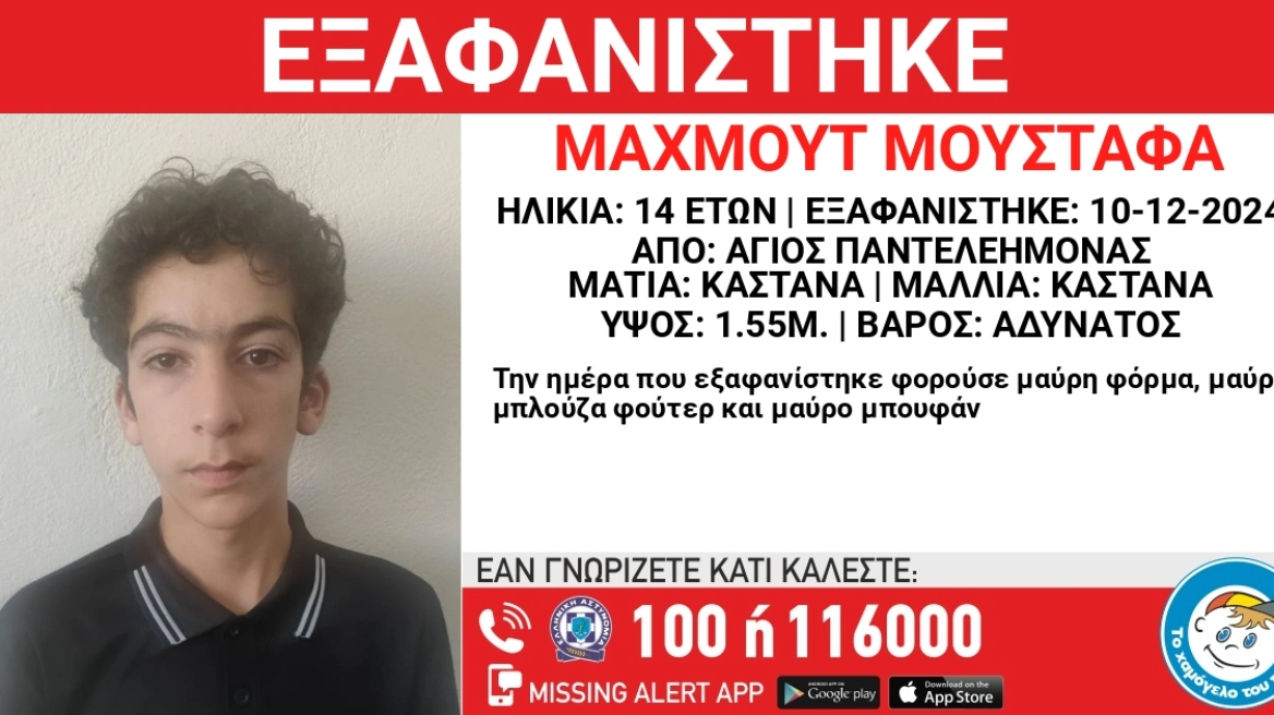 Συγκεκριμένα, ο 14χρονος Μαχμούτ (ον.) Μουσταφά (επ.), συριακής καταγωγής, εξαφανίστηκε στις 10/12/2024, βραδινές ώρες, από χώρο φιλοξενίας στον Άγιο Παντελεήμονα.