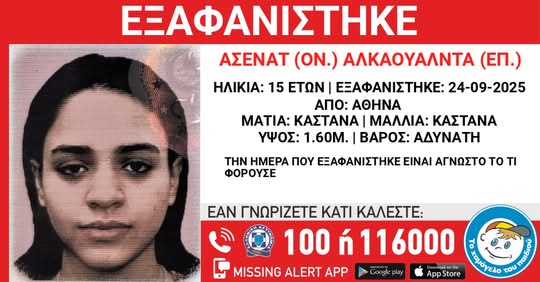 Στις 24/09/25, πρωινές ώρες, εξαφανίστηκε από χώρο φιλοξενίας, στην περιοχή της Αθήνας, η Ασενάτ (ον.) Αλκαουάλντα (επ.), 15 ετών, συριακής καταγωγής.