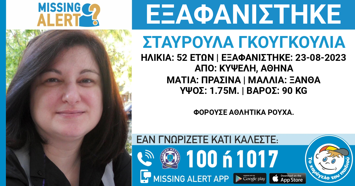 Στις 23/08/2023, μεσημεριανές ώρες, εξαφανίστηκε από την περιοχή της Κυψέλης, η Γκουγκουλιά Σταυρούλα, 52 ετών.