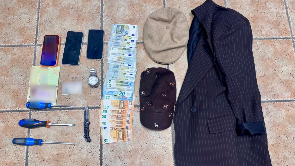 Στην κατοχή των συλληφθέντων βρέθηκαν και κατασχέθηκαν: 545 ευρώ, τρία κατσαβίδια, τρία κινητά τηλέφωνα, πτυσσόμενο μαχαίρι και ρουχισμός που χρησιμοποιήθηκε στις κλοπές.