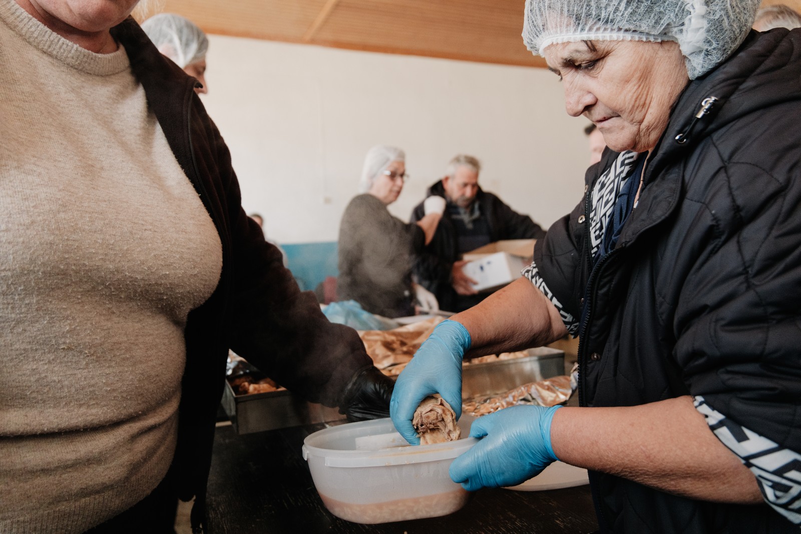 «Τα υλικά μας τα φέρνουν κάποιοι επιχειρηματίες εδώ τοπικοί, χωρίς να θέλουν να τους αναφέρουμε καθόλου. Ας πούμε ένας με μια βιοτεχνία ζωοτροφών μας έφερε 45 κιλά κρέας. Αυτό έβγαλε παραπάνω από 500 μερίδες.