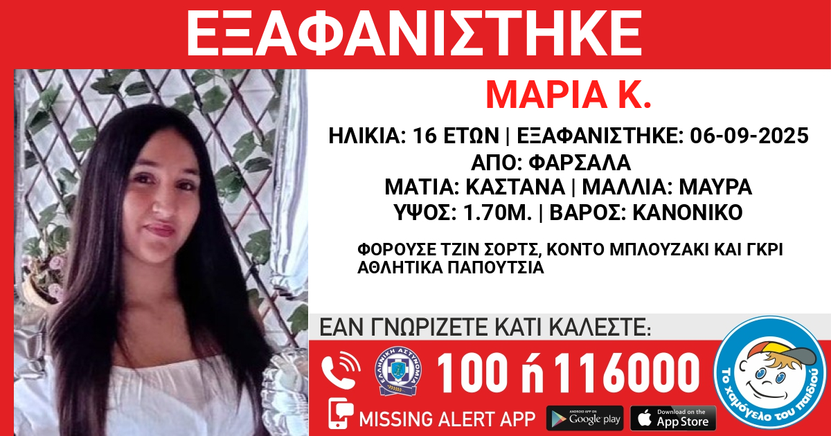 Συναγερμός έχει σημάνει στις Αρχές για την εξαφάνιση της 16χρονης Μαρίας Κ. από τα Φάρσαλα, το μεσημέρι του Σαββάτου 6 Σεπτεμβρίου.