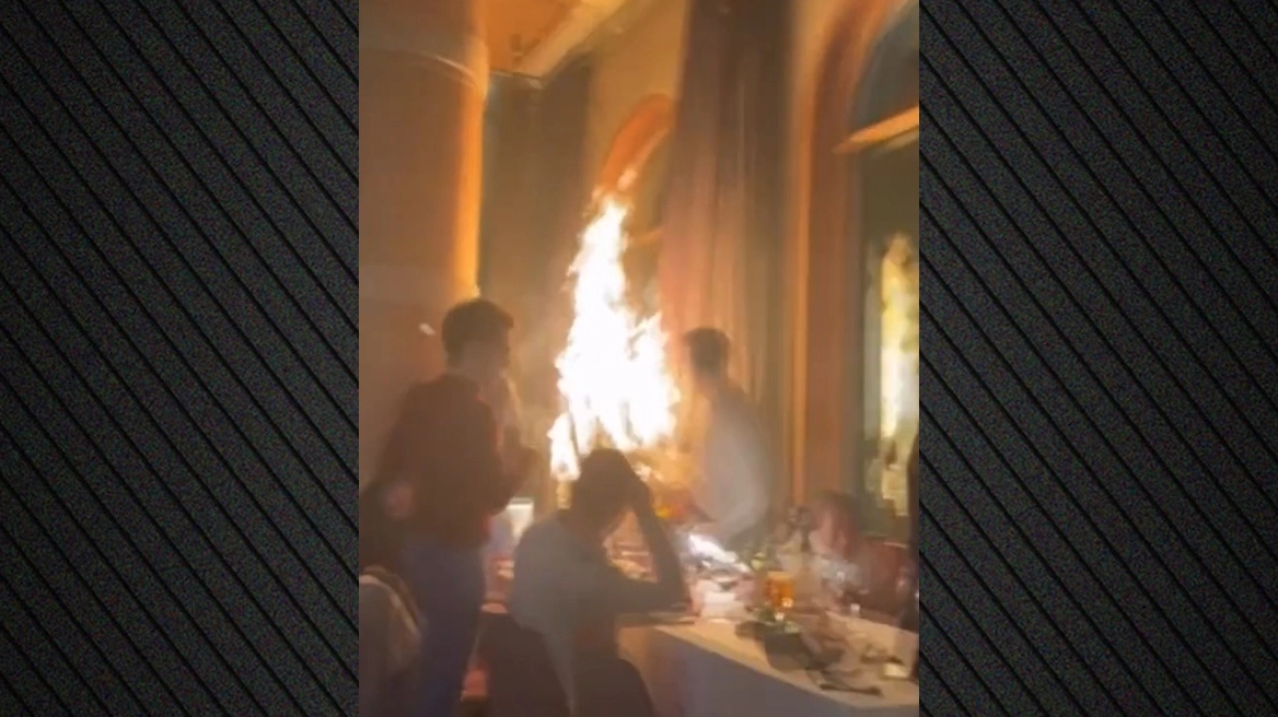 Στα πλάνα διακρίνεται μια κουρτίνα να παίρνει φωτιά τη στιγμή που πελάτες του εστιατορίου κρατούν πυροτεχνήματα εσωτερικού χώρου και τα κραδαίνουν στον ρυθμό της μουσικής, την ώρα που χορεύτριες παρουσιάζουν ένα σόου πάνω στο μπαρ.