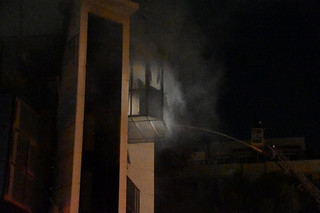 Στο σημείο επιχειρούν 18 πυροσβέστες με 6 οχήματα. Η φωτιά ξεκίνησε από τον πάνω όροφο του κτιρίου όπου στεγάζεται ο Realfm 97,8 και επεκτάθηκε προς τα κάτω.
