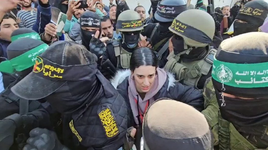 Βίντεο που κυκλοφορούν στα social media, δείχνουν την 29χρονη Ισραηλινή να μεταφέρεται από άντρες του Ισλαμικού Τζιχάντ εν μέσω πλήθους κόσμου και να περνά, μάλιστα, έξω από το κατεστραμμένο σπίτι του Γιαχία Σινουάρ.
