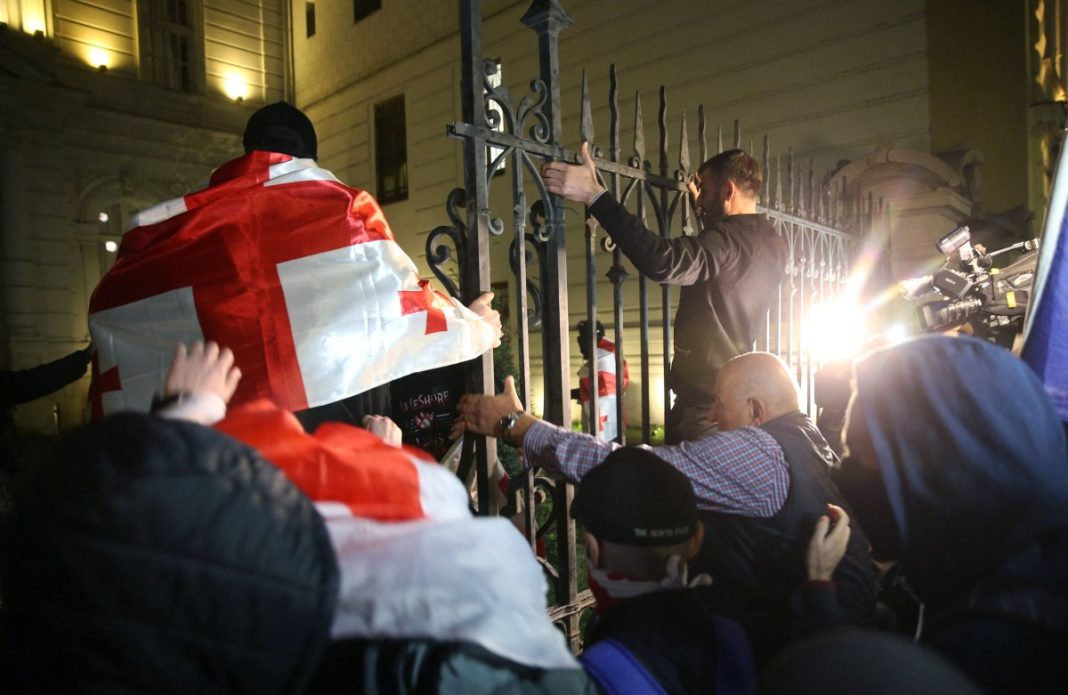 Μια ομάδα εισέβαλε στον προαύλιο χώρο της προεδρικής κατοικίας, σπάζοντας μεταλλικά κιγκλιδώματα. Οι αστυνομικές δυνάμεις απάντησαν με χρήση σπρέι πιπεριού για να διαλύσουν το πλήθος, ενώ ισχυρές ενισχύσεις ασφαλείας έχουν σταλεί στο κέντρο της Τιφλίδας.