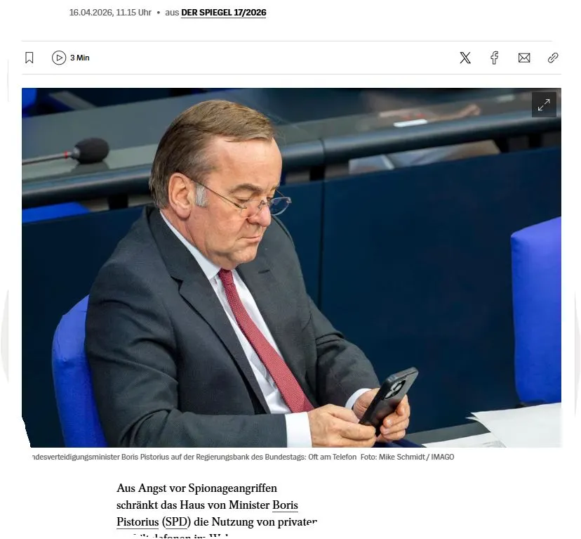 Από φόβο κατασκοπευτικών επιθέσεων, το Υπουργείο Άμυνας, με επικεφαλής τον Υπουργό Μπόρις Πιστόριους (SPD), περιορίζει δραστικά τη χρήση ιδιωτικών κινητών τηλεφώνων στο Υπουργείο και στα γραφεία των Γερμανικών Ενόπλων Δυνάμεων.