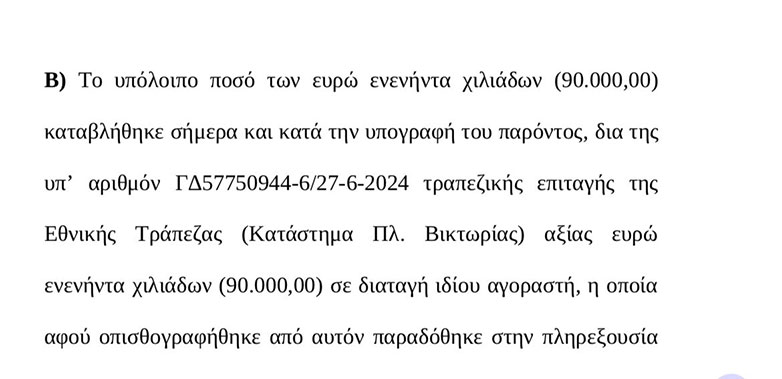 –90.000 ευρώ σε τραπεζική επιταγή δόθηκαν την ημέρα που έγινε η αγορά στο Συμβολαιογραφικό Γραφείο.
