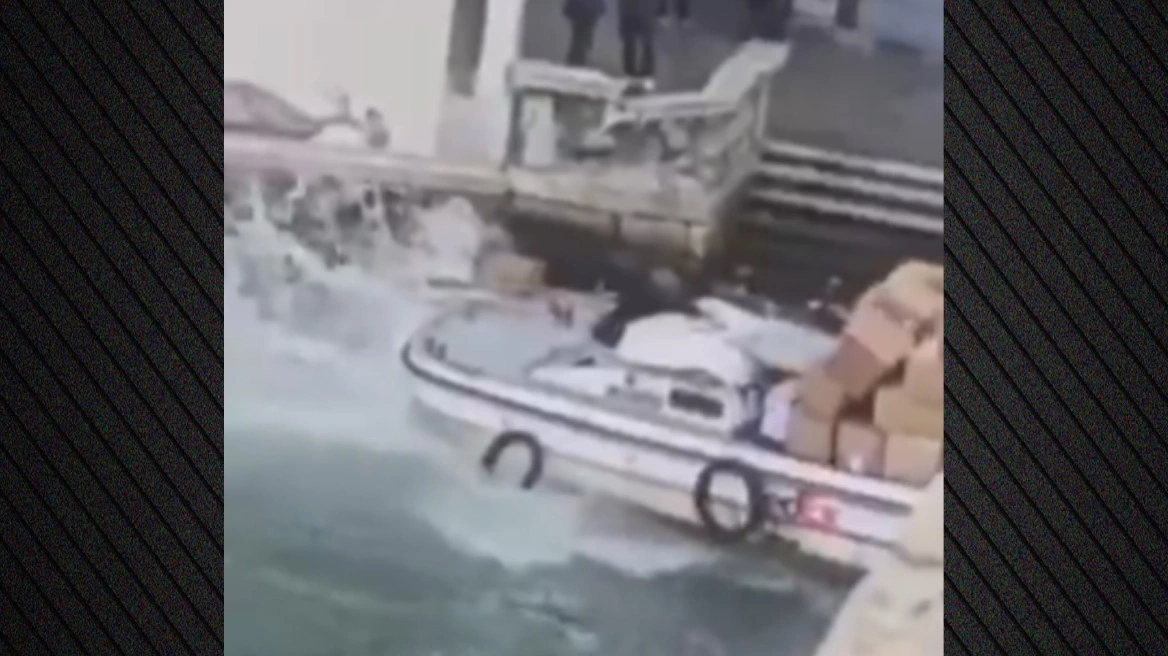 Το σκάφος φορτωμένο με δέματα φαίνεται να προσκρούει με ορμή σε μαρμάρινο στηθαίο κοντά στο ιστορικό κτίριο Fondaco dei Tedeschi