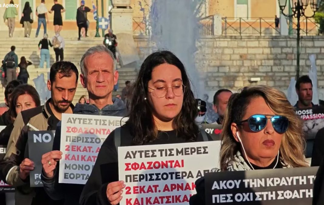 Οι vegan ακτιβιστές συγκεντρώθηκαν στην πλατεία Συντάγματος, κρατώντας πλακάτ με μηνύματα όπως «η σφαγή δεν είναι αγάπη» και «ήρθε η ώρα να δούμε τα ζώα ως άτομα», προσελκύοντας το ενδιαφέρον των περαστικών που έκαναν την κυριακάτικη βόλτα τους