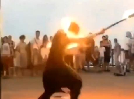 Όπως φαίνεται στο βίντεο, ο 35χρονος χορευτής Γκριγκόρι, βρίσκεται σε ένα θέρετρο στην Κριμαία. Ο ίδιος στριφογυρίζει ένα ραβδί που φλέγεται και στις δύο άκρες μπροστά στο συγκεντρωμένο πλήθος. Ο καλλιτέχνης βάζει το χέρι του στο στόμα και ξαφνικά οι φωτιές τον τυλίγουν.