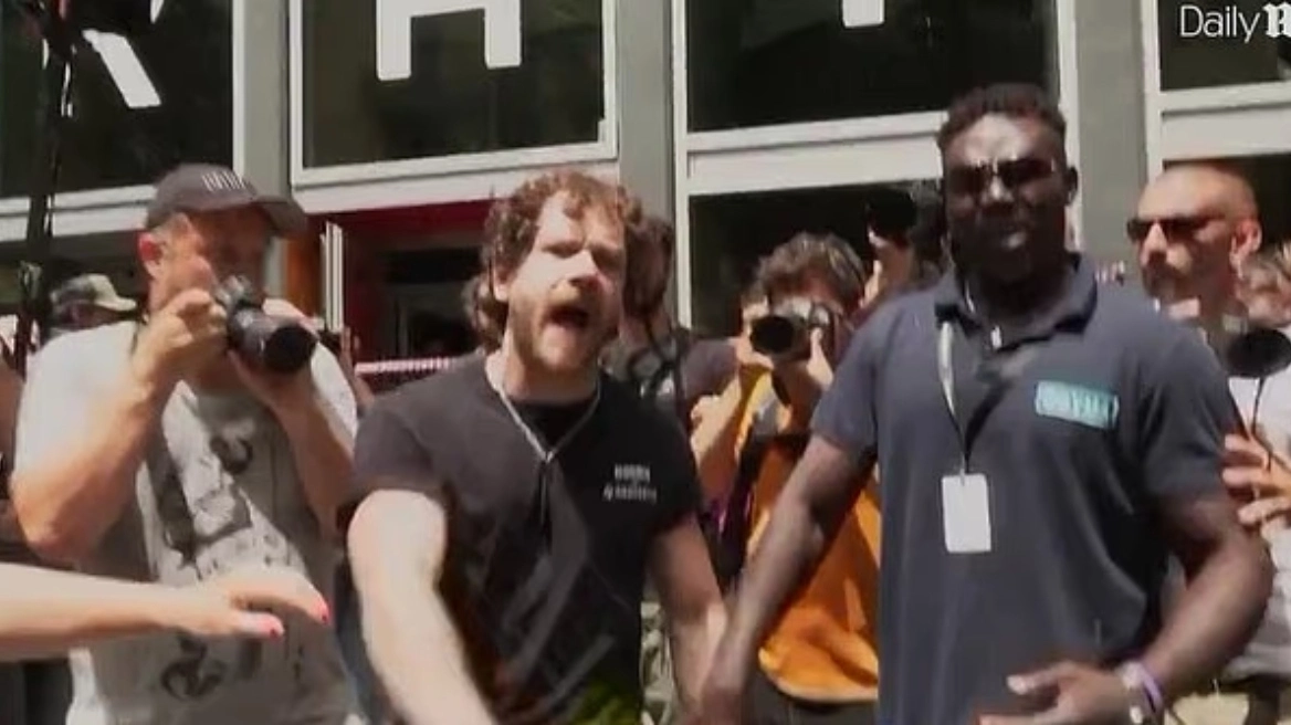 Στο βίντεο της Daily Mail, φαίνεται ο εξαγριωμένος υπάλληλος να βρίζει, να φτύνει και έπειτα να επιτίθεται στους διαδηλωτές, φωνάζοντας ότι «απλά δουλεύει», μη διστάζοντας να κόψει την ταινία.