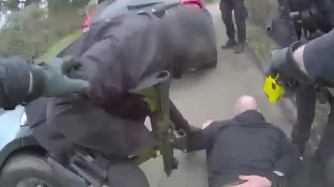 Στο βίντεο φαίνονται αστυνομικοί από την περιοχή του Νορθαμπτονσάιρ να του φωνάζουν να βγει από το αυτοκίνητό του και να πέσει στο έδαφος, ενώ τον σημαδεύουν με όπλα και τέιζερ προκειμένου να τον συλλάβουν.