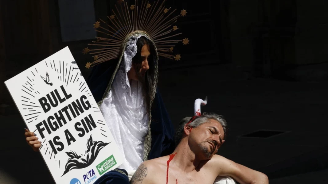 Ακτιβιστές των οργανώσεων AnimaNaturalis και People for the Ethical Treatment of Animals (PETA) πραγματοποίησαν σήμερα περφόρμανς διαμαρτυρίας κατά των ταυρομαχιών, ενόψει της αυριανής έναρξης του φεστιβάλ Σαν Φερμίν στην Παμπλόνα της Ισπανίας.