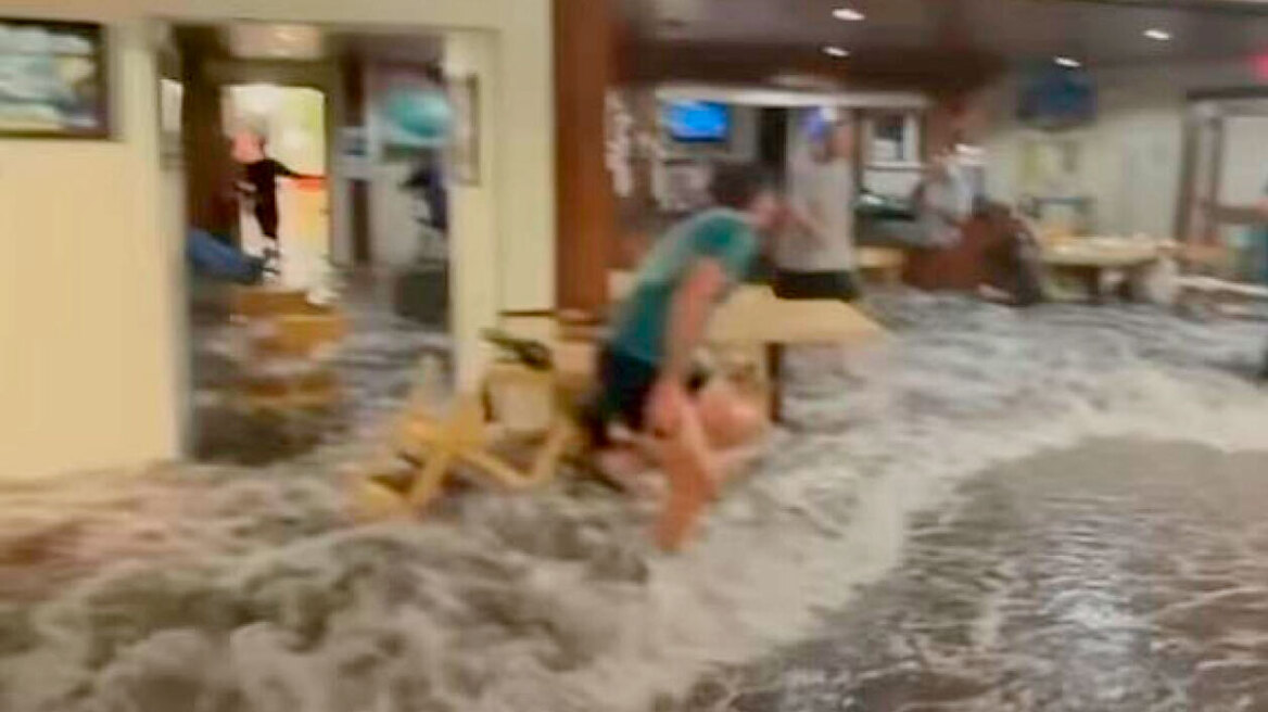Σε βίντεο μέσα από τη στρατιωτική βάση φαίνονται τα μεγάλα κύματα να σπάνε πόρτες και να παρασέρνουν τραπέζια, καρέκλες αλλά και κάποια άτομα που προσπάθησαν να κρατηθούν από όπου βρήκαν για να σωθούν.