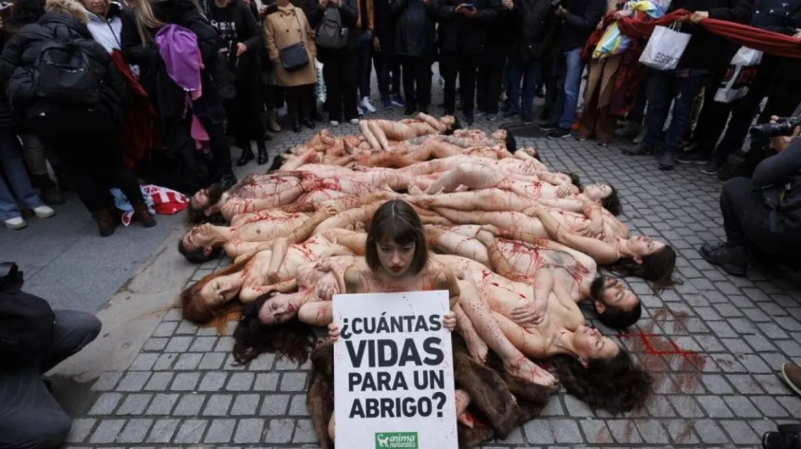 Οι συμμετέχοντες στη διαμαρτυρία έχουν ξαπλώσει γυμνοί στο έδαφος σε κεντρική πλατεία στην πρωτεύουσα της Ισπανίας και έχοντας βάψει τα σώματά τους με κόκκινη μπογιά που μοιάζει με αίμα -σε μια προσπάθεια αναπαράστασης των νεκρών ζώων- ζητούν να σταματήσει η μαζική σφαγή τους που αποσκοπεί στην κατασκευή γουναρικών και δερμάτινων ζωνών.