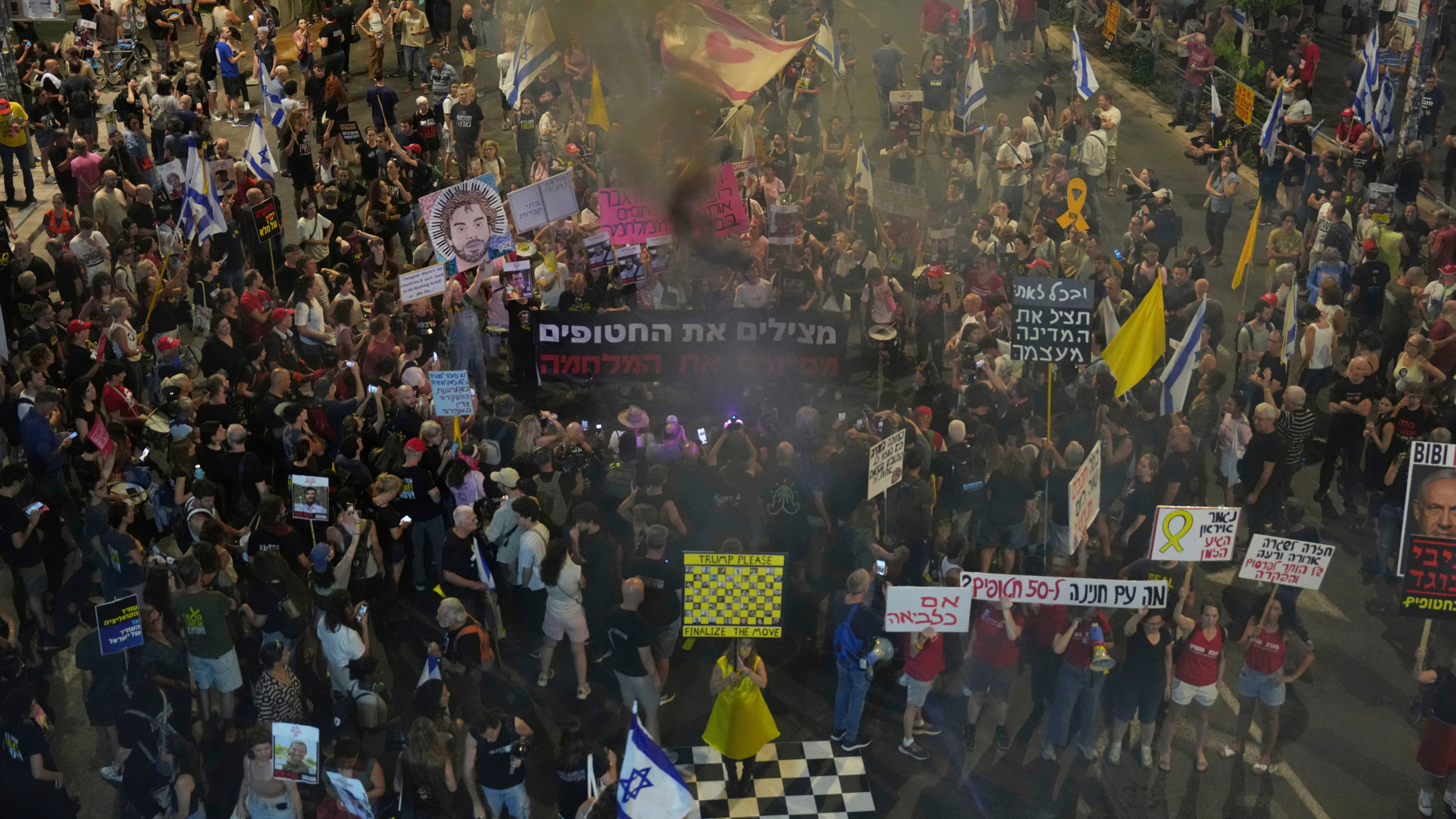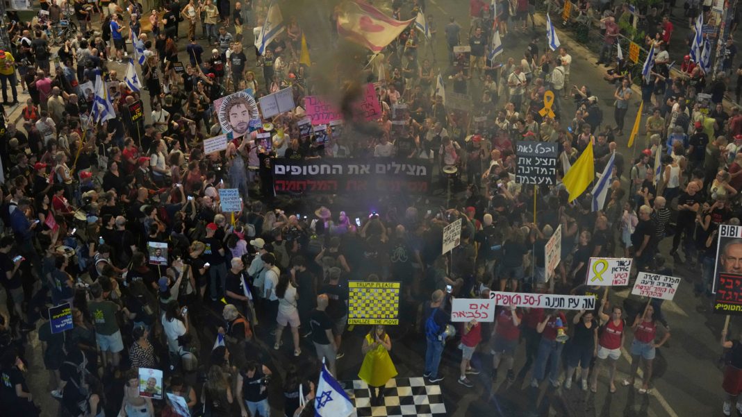 Το πλήθος κατέκλυσε την «Πλατεία των Ομήρων», στο κέντρο του Τελ Αβίβ. Πολλοί κρατούσαν ισραηλινές σημαίες και φωτογραφίες των Ισραηλινών που απήχθησαν από τη Χαμάς κατά την πρωτοφανή, αιματηρή επίθεσή της στο ισραηλινό έδαφος στις 7 Οκτωβρίου 2023. Με αφορμή εκείνη την επίθεση, η κυβέρνηση του Μπενιαμίν Νετανιάχου εξαπέλυσε μια στρατιωτική επιχείρηση με δεδηλωμένο στόχο να εξοντώσει την οργάνωση και να απελευθερώσει τους ομήρους.