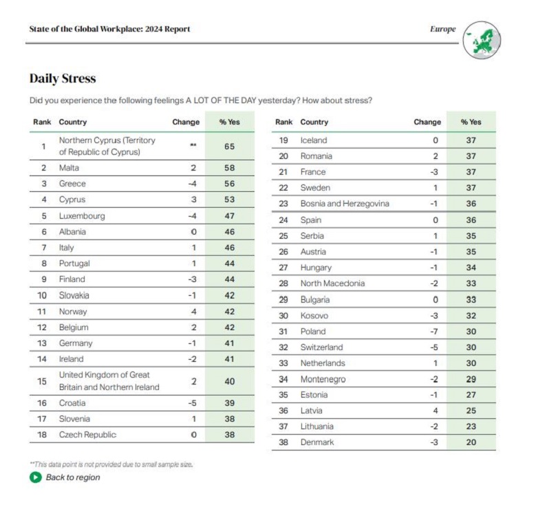 Τέλος, οι Έλληνες είναι οι τρίτοι πιο αγχωμένοι εργαζόμενοι στην Ευρώπη, με πρώτους όσους ζουν στα κατεχόμενα εδάφη της Κύπρου και δεύτερη την Μάλτα.