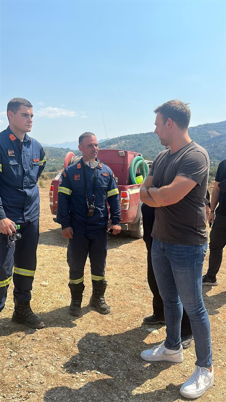 Ο Στέφανος Κασσελάκης συνομιλεί με πυροσβέστες